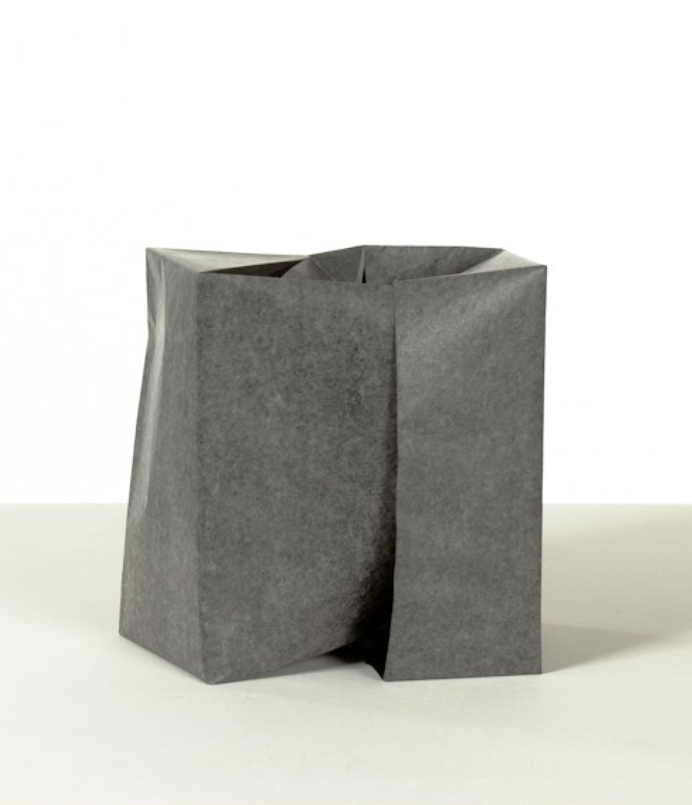 Das Auspacken, zuerst das Zeitungspapier, darunter eine Lage Kohlepapier, wird in einer Serie großformatiger Schwarz-Weiß-Fotografien dokumentiert und um eine weitere Bedeutungsebene erweitert. Durch das Umfalten entwickelt sich ein formales Eigenleben. Papier bekommt die Aura von Skulpturen mit steinartigen Oberflächen