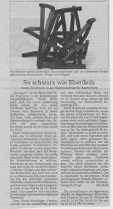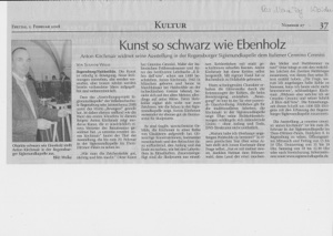 Als Anton Kirchmair das Angebot annahm, in dieser Kapelle auszustellen, ahnte er nicht, wie viel Kopfzerbrechen ihm die Eigensprache des Raumes machen würde. Wer ihn kennt, weiß um den Perfektionismus, mit dem er arbeitet. Und dieser Raum hatte ein Problem: nämlich die Schiene, die sich um seine Mitte herumzieht und ihm viel von seiner ursprünglichen Würde nimmt. Weil sie den Raum einschnürt wie der Draht die Weidenstäbchen Cenninis, die er während des Brennens bündelte, setzt Kirchmair seine bewegten Kohlenstäbe gegen die Starrheit der Schiene. An ihr entlang tänzeln die Linien seiner Zeichnungen. In die Interaktion beider werden wir als Betrachter miteinbezogen.
