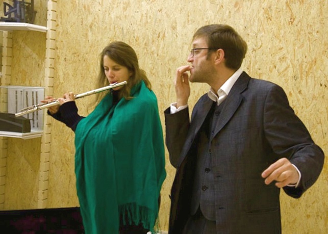 Es war schon bemerkenswert: Zwei Musiker im Künstleratelier, die mit Hilfe einiger Flöten, eines Computers, zweier Wii-Controller und einer erstaunlichen Vielzahl stimmlich und körperlich erzeugter Geräusche ein recht ungewöhnliches Konzert bestreiten. Möglich wurde das durch die Veranstaltungsreihe „Kunst am 22.“, an der sich eine kleine Gruppe handverlesener Ateliers im Bayerischen Wald beteiligt. Am 22. eines jeden Monats öffnen – in regelmäßigem Turnus – die Ateliers des Künstlers Anton Kirchmair, des Fotografen Franz Hintermann und der Keramikerin Renate Balda ihre Tore, um den Besuchern einen außergewöhnlichen Zugang zur Kunst zu präsentieren und Diskussionen darüber in Gang zu bringen. So waren am 22. Oktober der Komponist und Countertenor Alex Nowitz und die Flötistin Sabine Vogel aus Berlin in Marchhäuser zu Gast, wo sie zwischen den Druckgraphiken und den hölzernen Objekten von Anton Kirchmair dem von weither angereisten Publikum einen Einblick in die stark mit Geräuschen arbeitende Szene frei improvisierter Musik gaben, in der die beiden unter anderem am Amsterdamer STEIM (studio for electro-instrumental music) ausgebildeten Künstler arbeiten. ....................................
