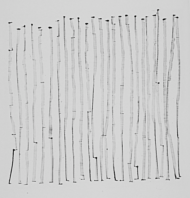Bei ganzheitlicher Betrachtung wirken die zeichenhaften Linien wie langgestreckte Buchstaben, die den Rezipienten wiederholt zu dem – letztlich vergeblich bleibenden – Versuch animieren, einen Sinnzusammenhang zu entziffern. Nähert sich der Betrachter dem Blatt, ergeben sich wieder neue Einsichten: Nun erinnern die sanft geschwungenen, transparenten Werkspuren eher an mikroskopisch vergrößerte vegetabile Strukturen..„